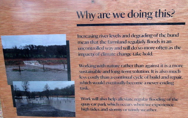 In October this year, a breach was made in the levee above the Cotehele car park and a long narrow meadow between the riverbank and a woodland on the rising valleyside, up as far as the river cliff downstream of Calstock was opened to inundation. This land belongs to the National Trust and the public footpath runs through the base of the adjacent woodland, so views can be had through the trees, of the newly-developing wetland.